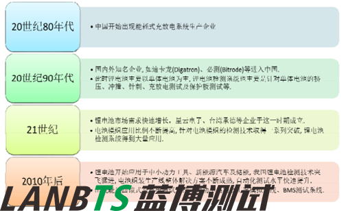 進入21世紀后, 3C產品、電動工具、電動自行車等領域對鋰電池需求大增,出現了數字化檢測、化成分容、電池及動力電池組檢測、電池保護板檢測等檢測技術。 2010年之后,新能源汽車和儲能應用產品在國際范圍快速發展,行業進入高速發展期,鋰離子電池檢測系統行業涌現出工況模擬系統、能量回饋系統和大功率檢測系統、 BMS檢測系統等新一代產品,行業向自動化、系統化方向邁進。